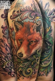 大臂彩绘狐狸与各种晶体纹身图案