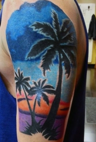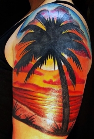 大臂绚丽多彩的日落与棕榈树纹身图案