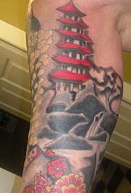 大臂亚洲风格彩色寺庙与花朵纹身图案