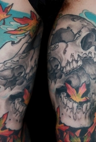 大臂幻想人类骷髅枫叶和寺庙纹身图案