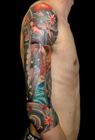 传统的亚洲风格彩色花朵和艺妓手臂纹身图案