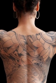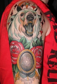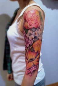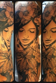 old school大臂黑白女性肖像与各种花卉纹身图案