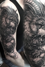 华丽的黑色恶魔狮子与山羊角大臂纹身图案