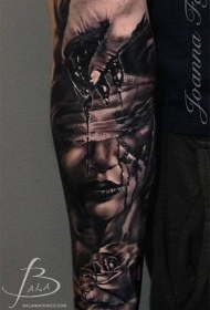 手臂黑色血腥女人肖像手和玫瑰纹身图案