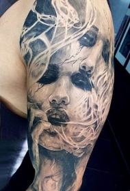 令人惊叹的大臂黑色女人脸与烟雾纹身图案