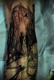 小腿令人毛骨悚然的黑暗森林与骷髅纹身图案