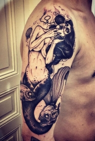 手臂黑色美人鱼和邪恶鱼纹身图案