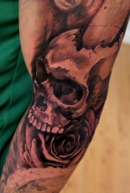 胳膊常见的黑色骷髅和玫瑰纹身图案