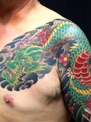 男生彩色半甲传统邪龙纹身图案