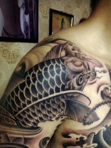 超级霸气的半甲黑灰鲤鱼纹身图案