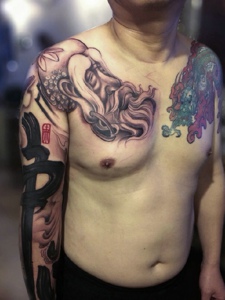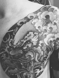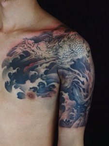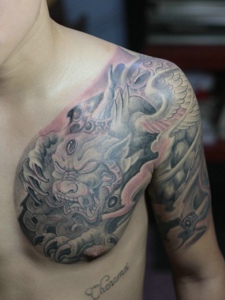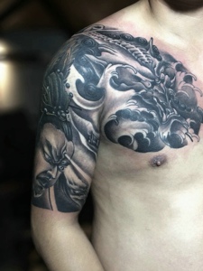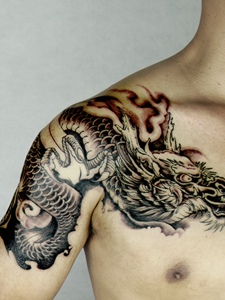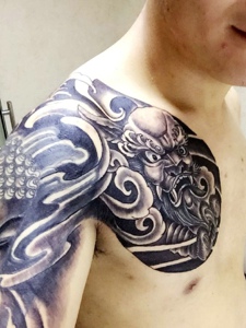 豪气十足的黑白半甲邪龙刺青