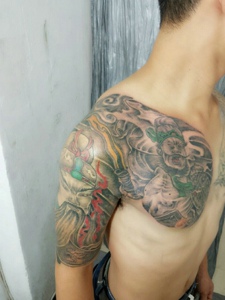 彩色半甲鲤鱼和般若结合的纹身