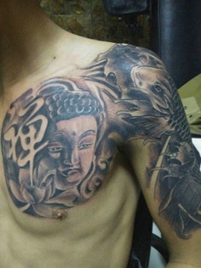佛像和鲤鱼结合的黑白半甲纹身