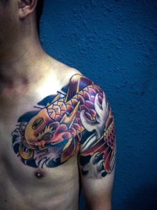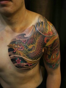 80后帅气小男生的彩色半甲鲤鱼纹身