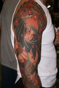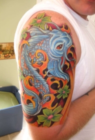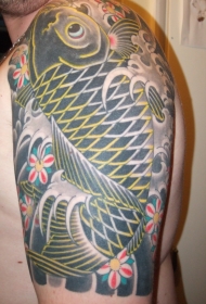 肩部彩色花朵与锦鲤纹身图案