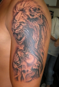肩部棕色咆哮狮和母狮纹身图案