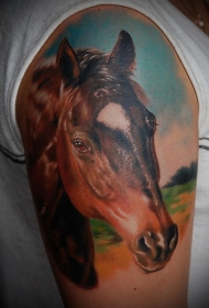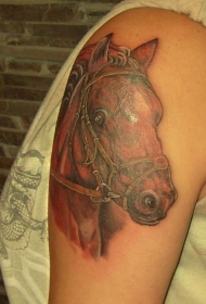 肩部彩色逼真的马头纹身图案