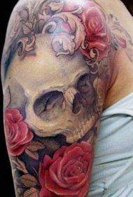 肩部彩色骷髅头和玫瑰纹身图案