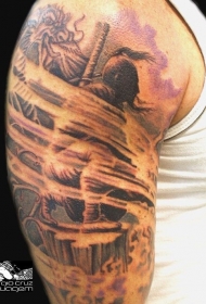 肩部彩色日本武士纹身图片
