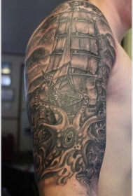 肩部灰色章鱼攻击半个船上的纹身图案