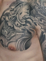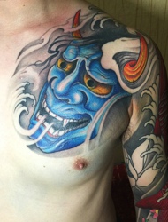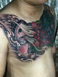 魁梧男士的半甲般若纹身显个性