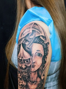 般若与女神肖像结合的大臂纹身刺青