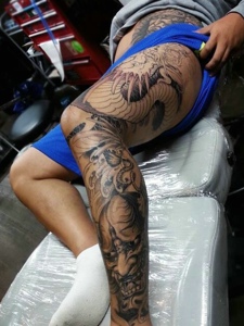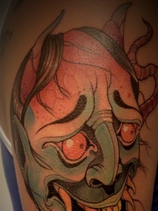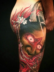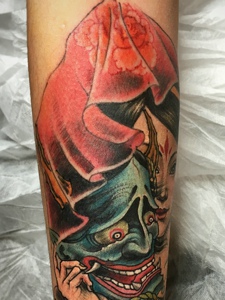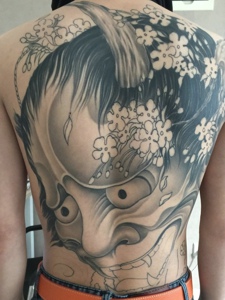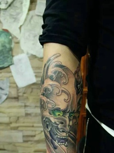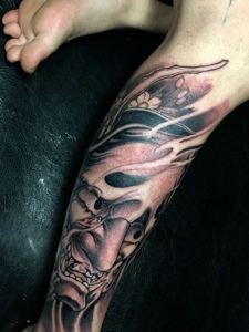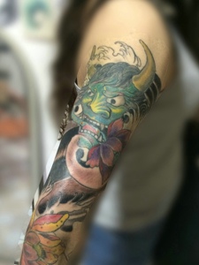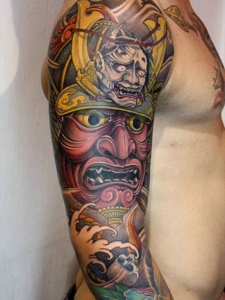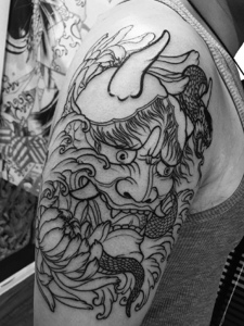 般若与鲤鱼结合的炫丽半甲纹身图片