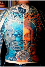 满背彩色阴阳八卦鱼龙佛像宗教纹身图案
