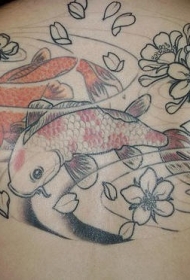 背部花朵与游泳的鲤鱼纹身图案