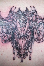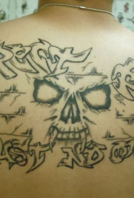 背部黑色恶魔脸与字母纹身图案