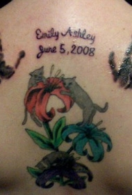 背部手印和猫花卉彩色纹身图案