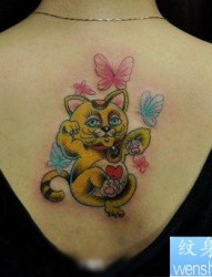 女孩子背部好看的彩色招财猫纹身图片