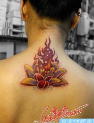 美女背部好看的莲花与火焰纹身图片