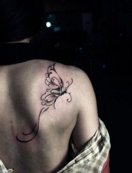 美女肩背唯美经典的黑灰蝴蝶纹身图片