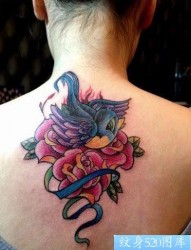 女人背部好看的燕子与玫瑰花纹身图片