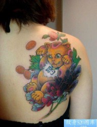 美女背部好看的彩色招财猫纹身图片