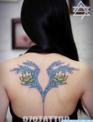 美女背部漂亮的彩色莲花纹身图片