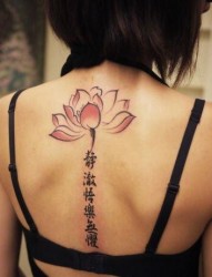 美女背部莲花与汉字纹身图片