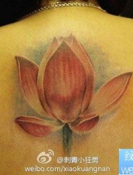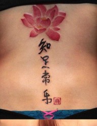 女人后背漂亮唯美的彩色莲花与书法汉字纹身图片