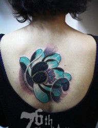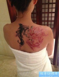 美女后背漂亮好看的写意莲花鲤鱼纹身图片