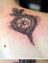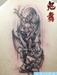 男生后肩背潮流时尚的十字架翅膀纹身图片