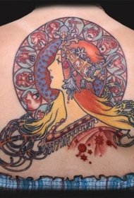 满背黑白神秘部落女性肖像结合骷髅纹身图案