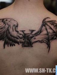 男生背部天使与恶魔翅膀纹身图片