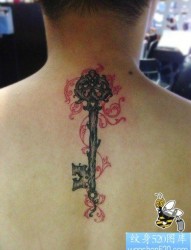 男人后背潮流经典的钥匙纹身图片