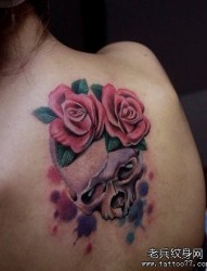 一幅女人背部骷髅头玫瑰花文身图片由纹身520图库推荐