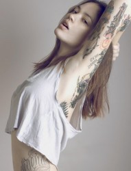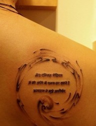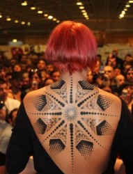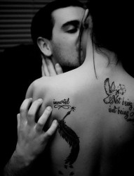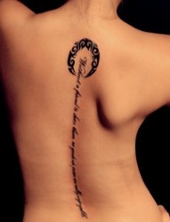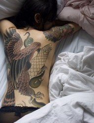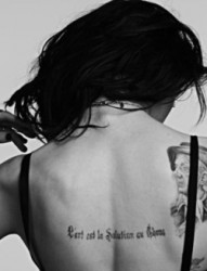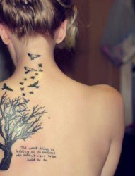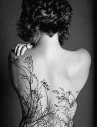 女性背部漂亮的花朵和蕾丝组合的纹身图案