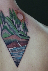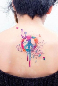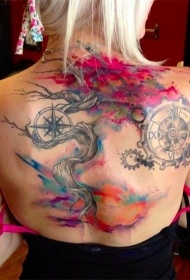 背部彩色枫叶和女子手枪乌鸦纹身图案