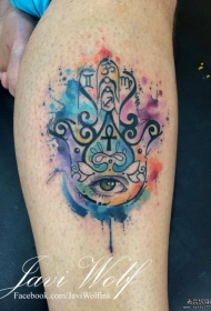 小腿彩色泼墨法蒂玛之手纹身图案