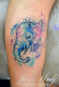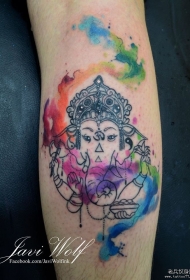 小腿象神泼墨彩色纹身图案