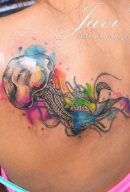 背部水母彩色泼墨纹身图案